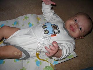 As for Cooper.... he is well.  We have to see a specialist in a few days about his poo...or should I say lack there of?!?! Poor guy can't seem to poo by himself.  I had to give him suppositories and those suck!  I feel horrible for him having something shoved up there that shouldn't be.  The good thing about the whole situation is that he doesn't act like he is in pain at all.  He continues to eat, sleep and play normally.  When he does poo it isn't hard at all.  He puzzled the pediatrician for sure!  With that being said, Cooper saw his Dr. three times in a week.  UGH!!  Twice for lack of poo and once for his FOUR MONTH checkup.  I cannot believe he is four months!!  He weighed 9.4 oz and is 23 inches long... so he is on the very small side (under 5th percentile) but he is normal otherwise!!  We were definately blessed with a GREAT kid!